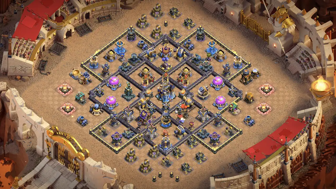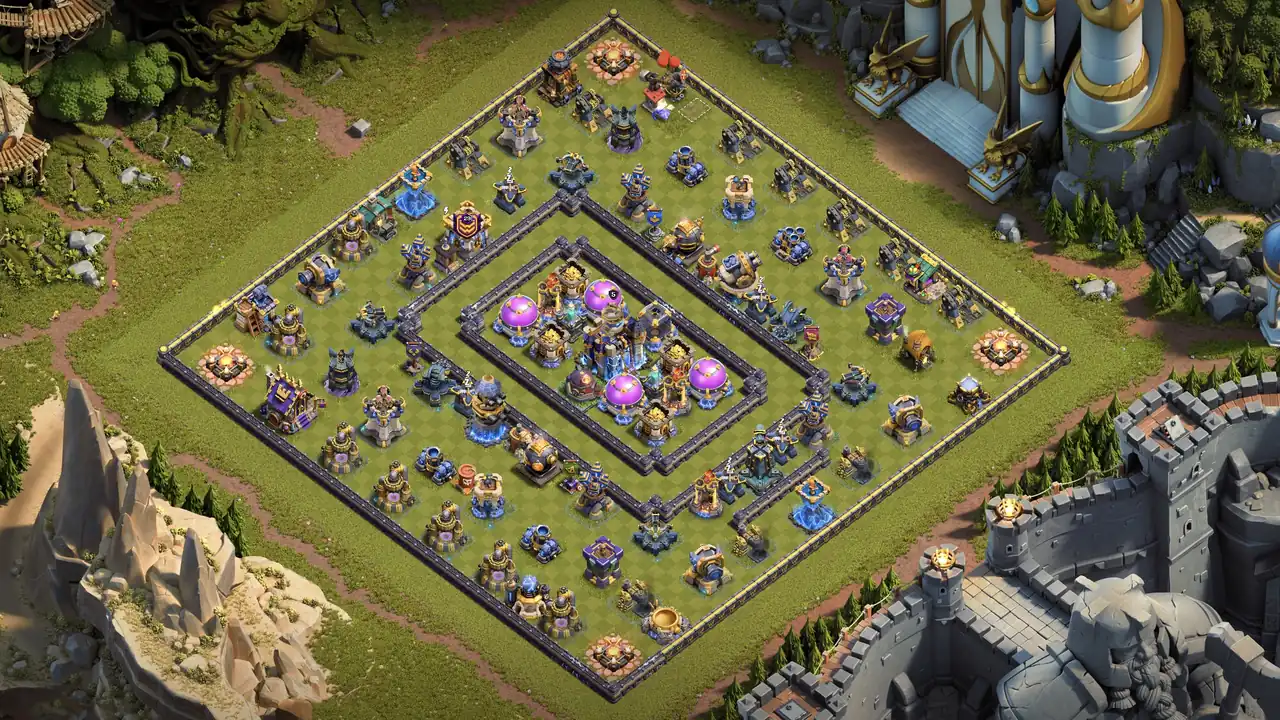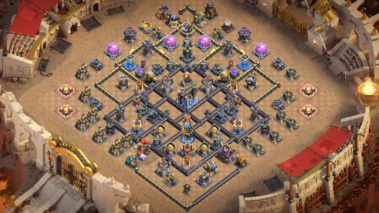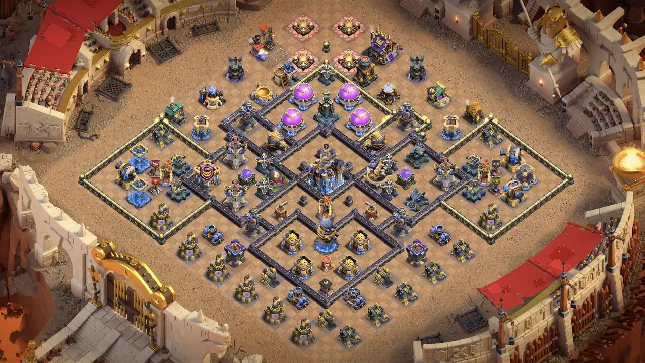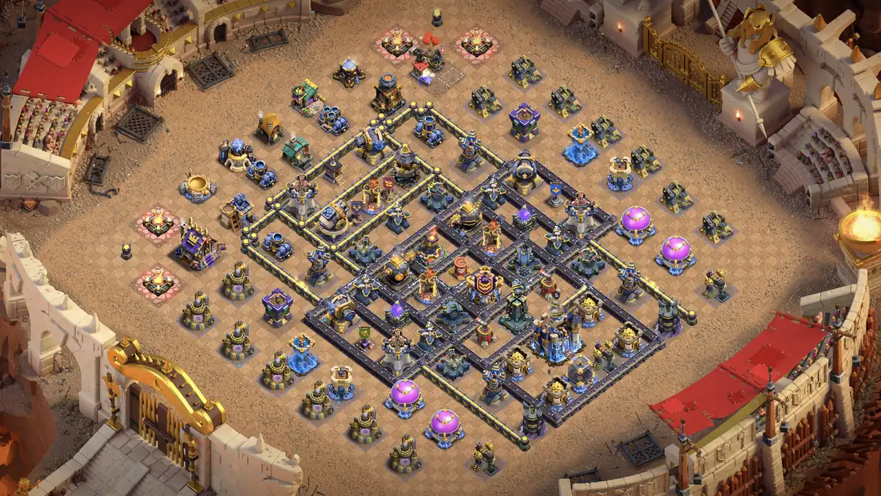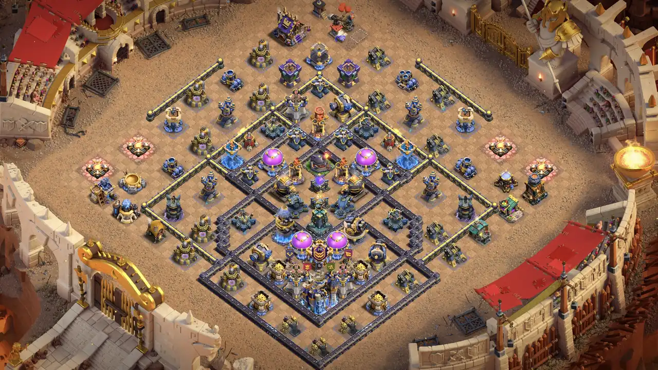 ผังนี้แกล้วภูมิใจนำเสนอ แกล้วใช้ในวอร์ลีกและลีกตำนาน มีหลายครั้งที่เสียแค่ 1 ดาว ด้วยการออกแบบอาวุธที่ห่างกัน ทำให้นักขว้างหอกหรือลูกไฟทำงานได้ไม่ดีที่สุด หอคอยอาคมคลุ้มคลั่งและอาคมพิษกลางฐาน ยากที่จะเจาะเข้าไปถึงด้วยลูกไฟ หากเล่นก็เสี่ยง