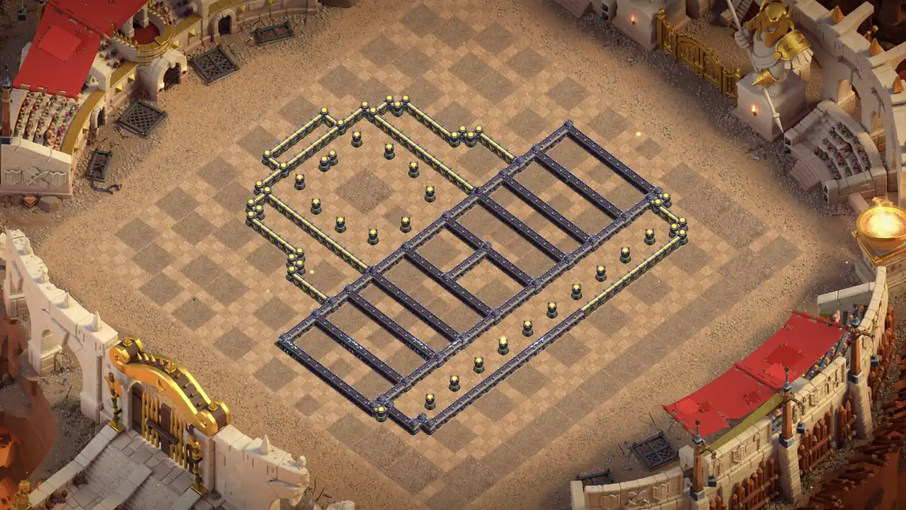 ออกแบบโดยสร้างโซนว่างเยอะ ส่งผลให้ทหารไหลออกข้าง อาวุธสำคัญส่วนใหญ่ห่างจากกำแพง 5 ช่อง ทำให้เล่นนักขว้างหอกยาก จุดอ่อนคือหอคอยอาคมคลุ้มคลั่งอยู่ด้านริม อาจโดนเปิดการทำงานง่าย แต่เครื่องยิงลาวาอยู่กลางฐาน ไม่ง่ายสำหรับสูตรพื้นดิน
