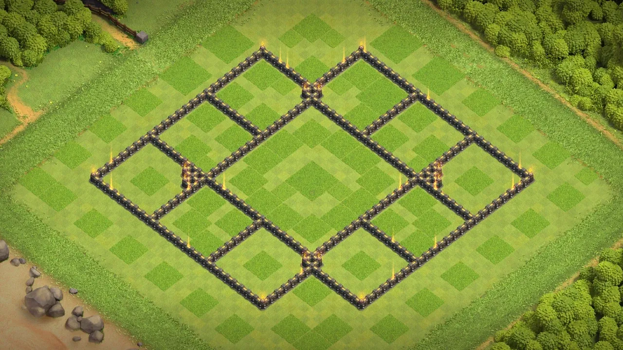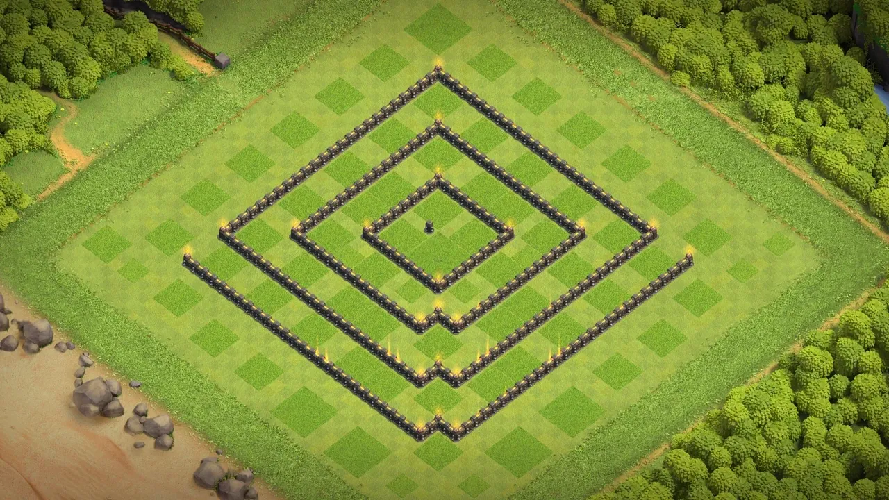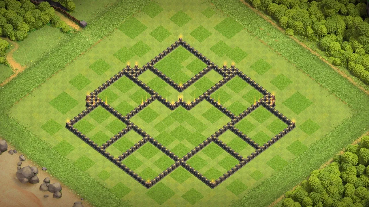 - ผังนี้เป็นทรงกล่องกว้าง บ้านอยู่ตรงกลาง กระจายพลังโจมตีแบบครอบคลุม มีกับดักด้านในและคันศรเอ็กซ์คุมด้านข้าง