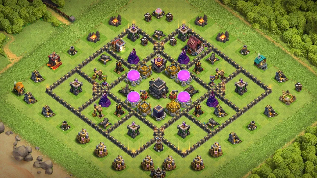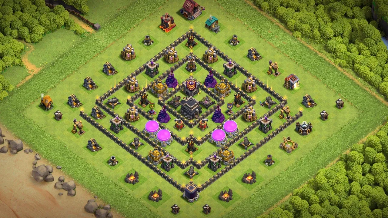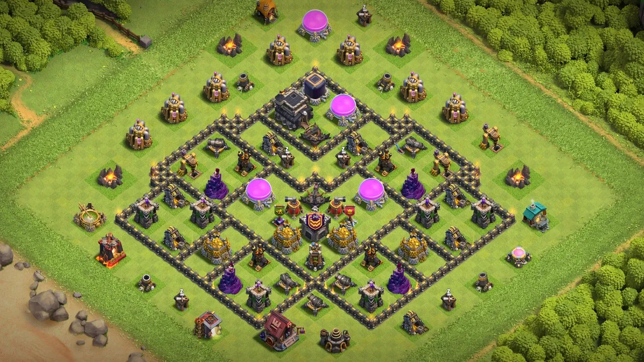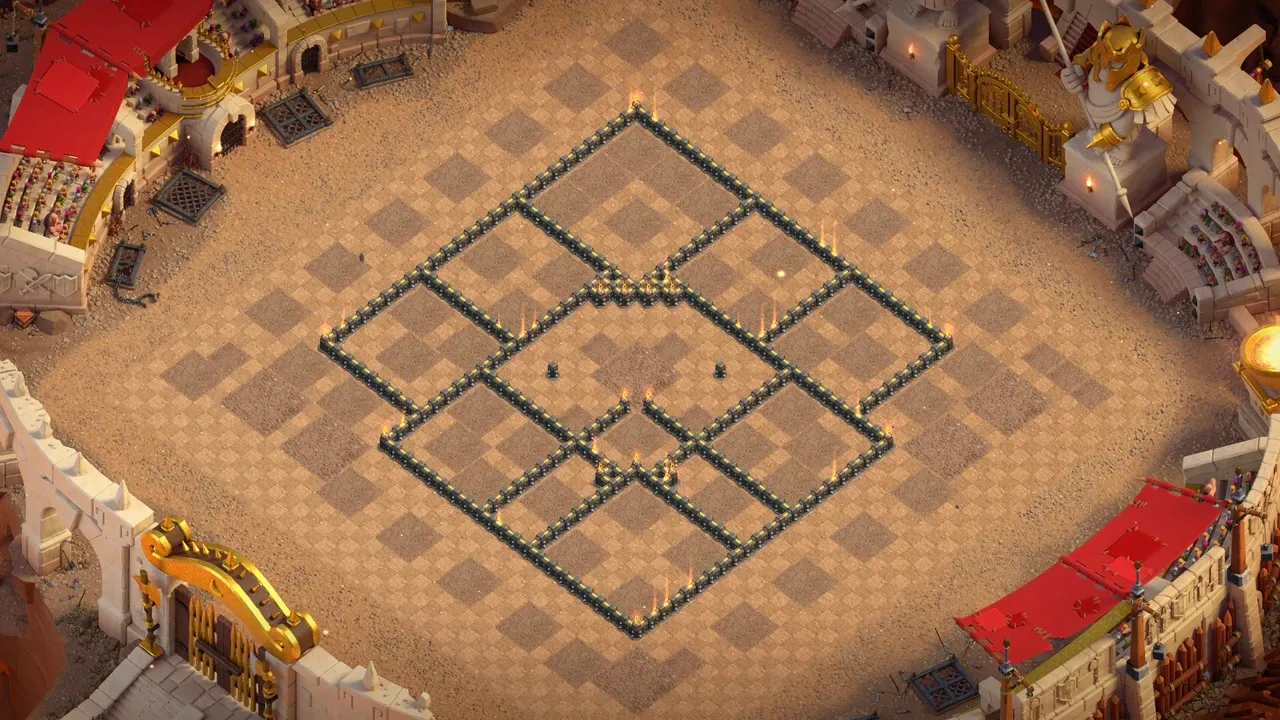 - ผังนี้เป็นทรงกล่องกว้าง บ้านอยู่ตรงกลาง กระจายพลังโจมตีแบบครอบคลุม มีกับดักด้านในและคันศรเอ็กซ์คุมด้านข้าง