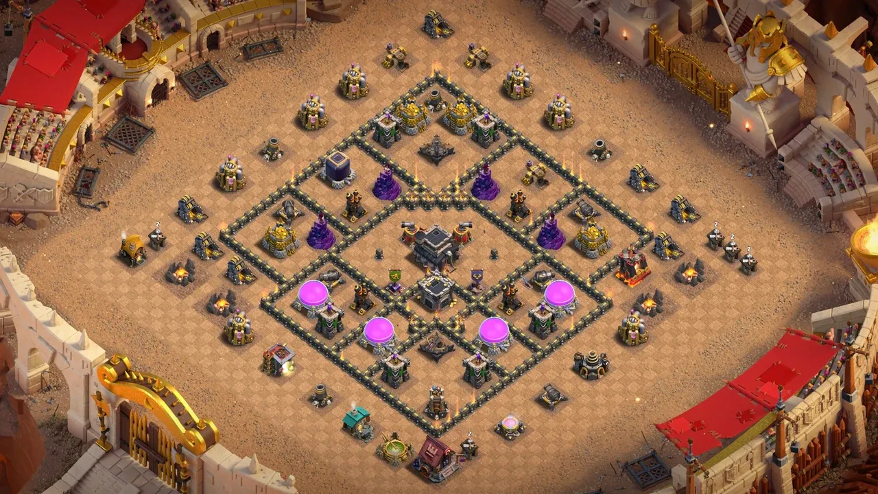 - ผังนี้เป็นทรงกล่องพร้อมป้องกันคลังเก็บทรัพยากรอย่างดี ลดแรงจูงใจในการฟาร์มจากผู้เล่นบ้านเลเวลต่ำกว่า